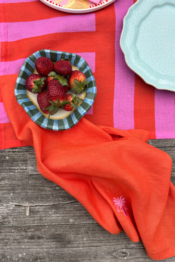 Hand dyed red linen blend napkins embroidered with a contrast palm illustration. This classic napkin set contains two cloth napkins that can be paired with complimentary table linen. A refreshing garnish to the table. Practical and stylish, our cloth napkins are statement pieces that blend well with staple dinnerware.