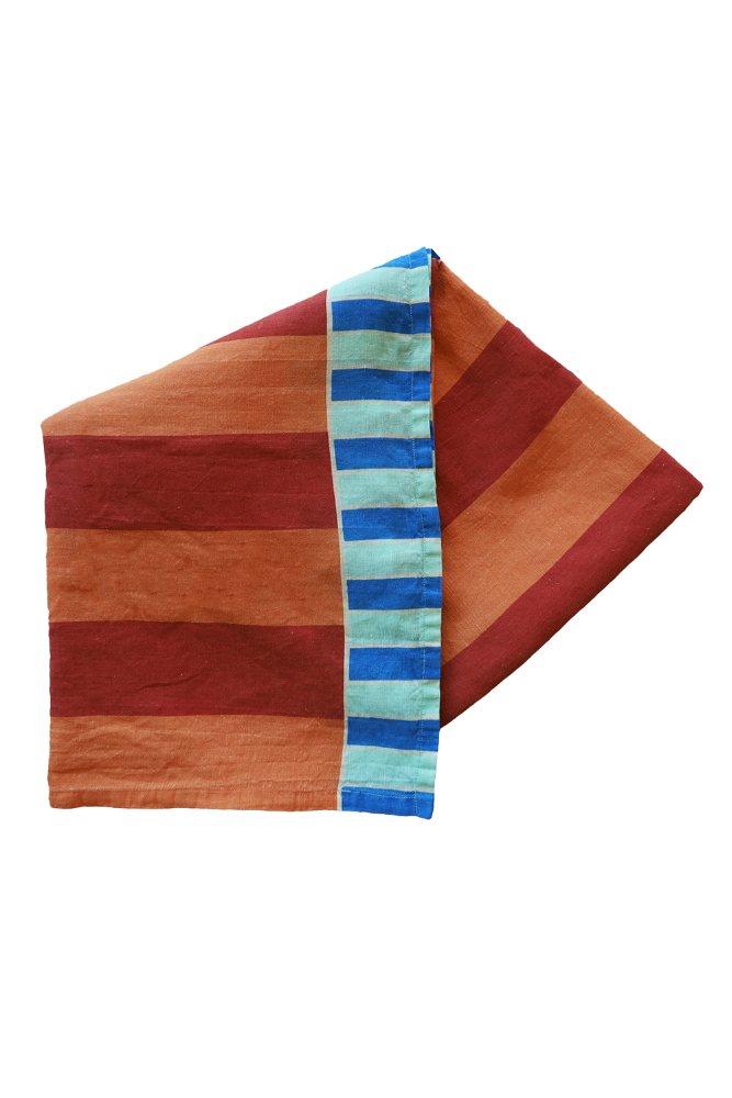 The Dusk Tablecloth, designed with a harmonious earthy paprika colour stripe. The core ingredient of any great table setting. Designed to be paired back with crockery staples from the home. Made to mix and match. Generally suits a 6-8 seater table.