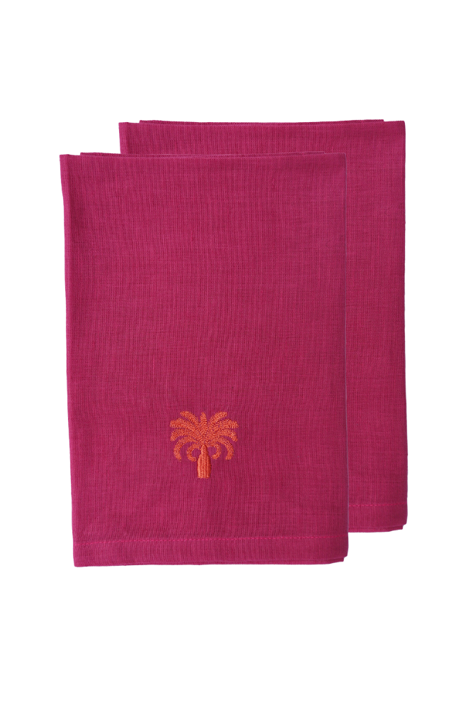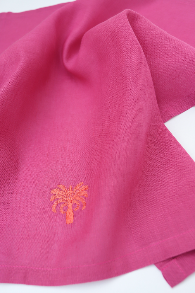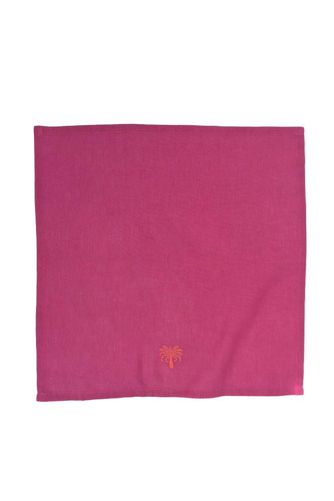 Hand dyed plum linen blend napkins embroidered with a contrast palm illustration. This classic napkin set contains two cloth napkins that can be paired with complimentary table linen. A refreshing garnish to the table. Practical and stylish, our cloth napkins are statement pieces that blend well with staple dinnerware.