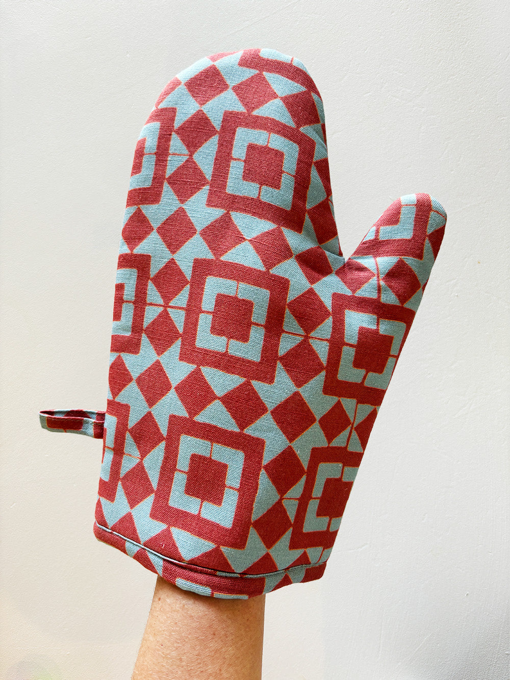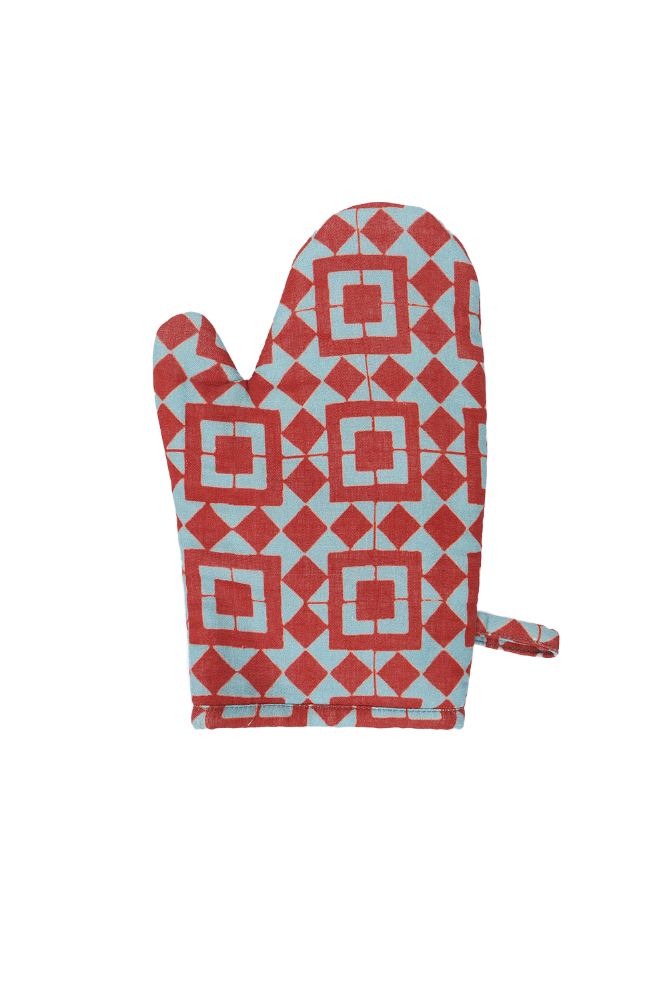 Our linen oven mitt has a cozy padded inner for extra heat protection and a snug fit so that is stays put when handling hot dishes. Featuring a tiled rust and powder blue print, this stylish kitchen glove will keep you kitchen-chic when prepping any meal.