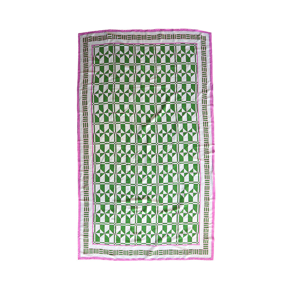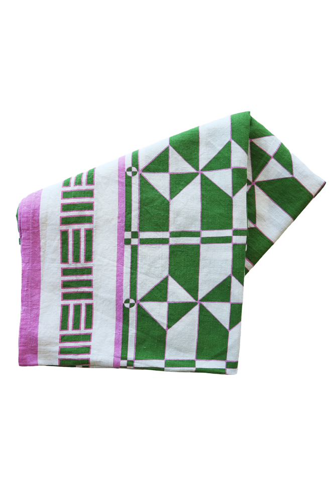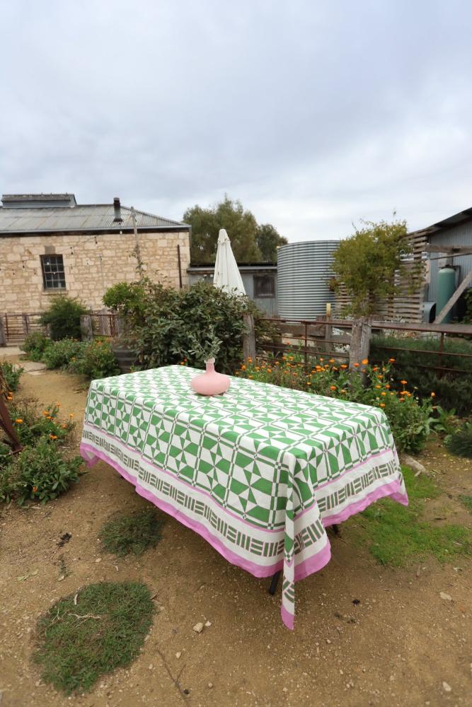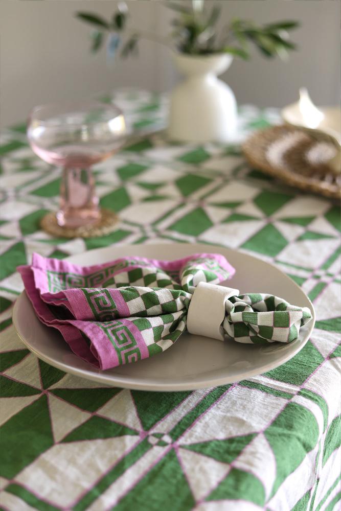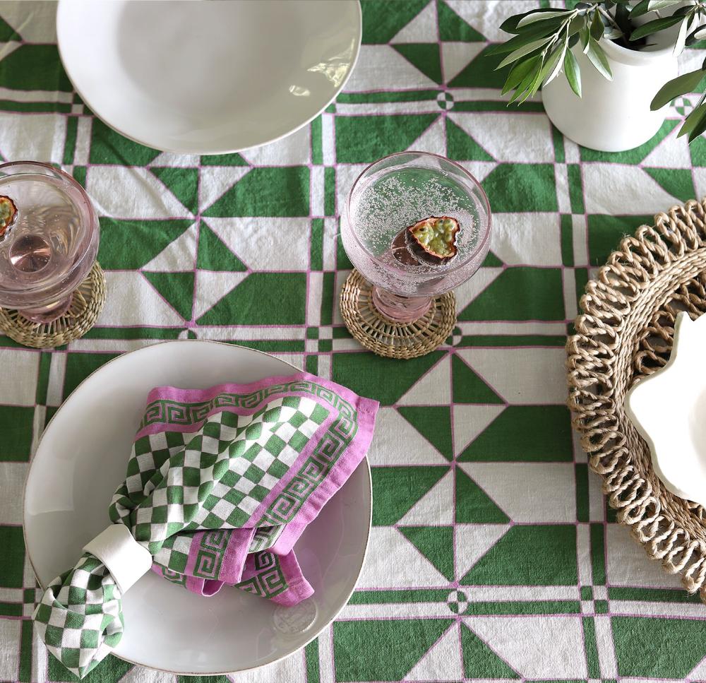 The Palazzo Tablecloth, a patterned blend of green and beige. The core ingredient of any great table setting. Designed to be paired back with crockery staples from the home. Made to mix and match.