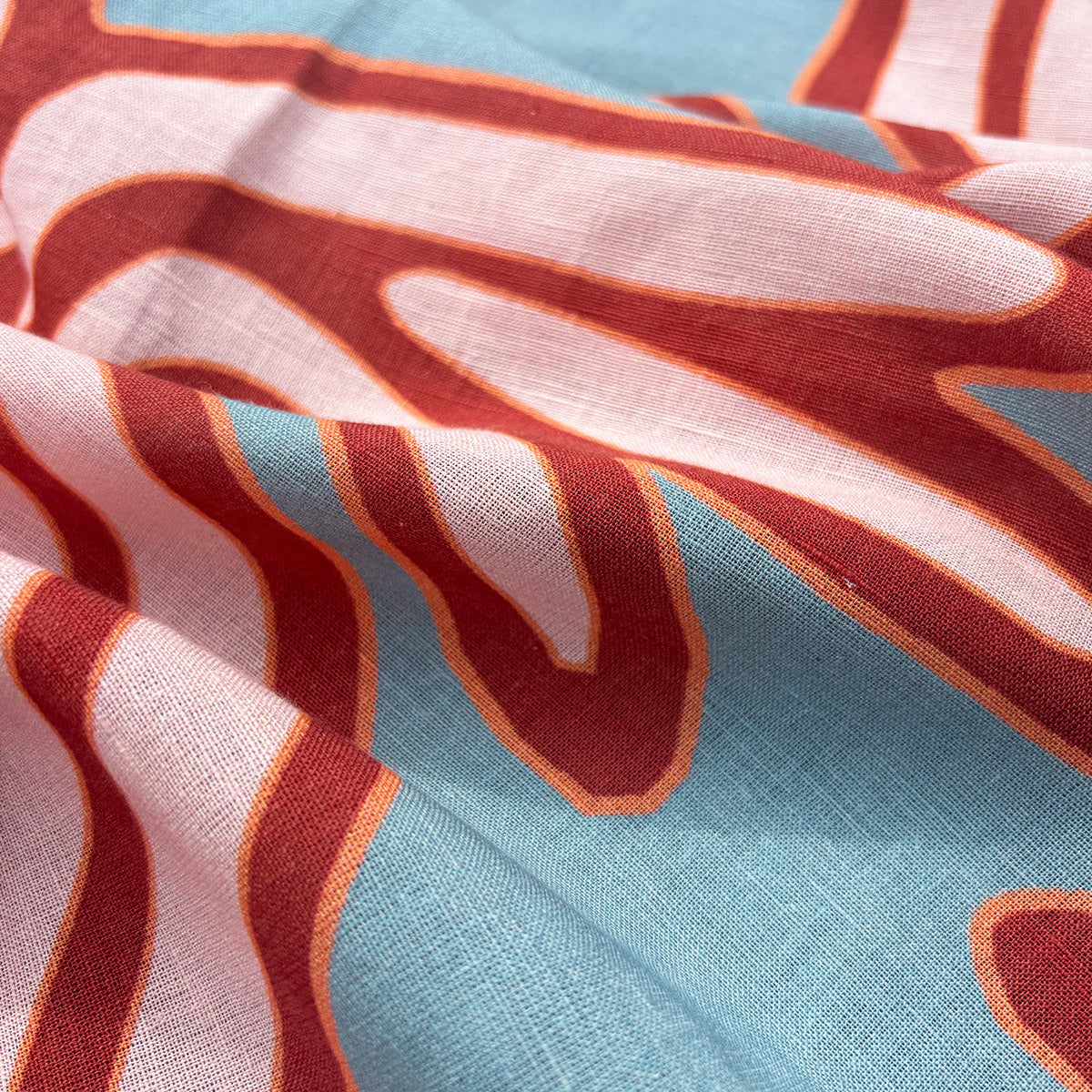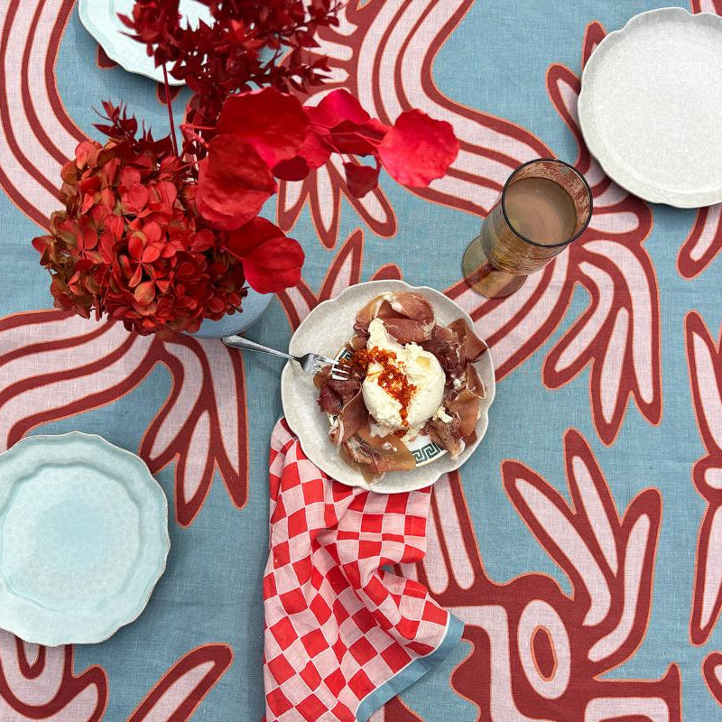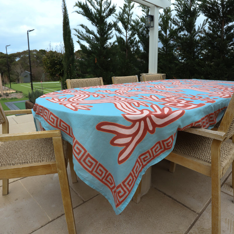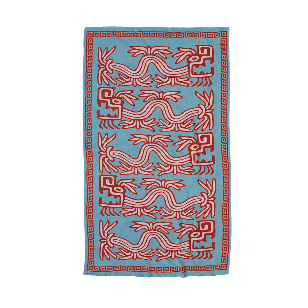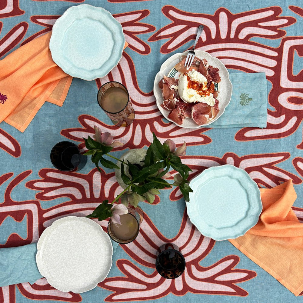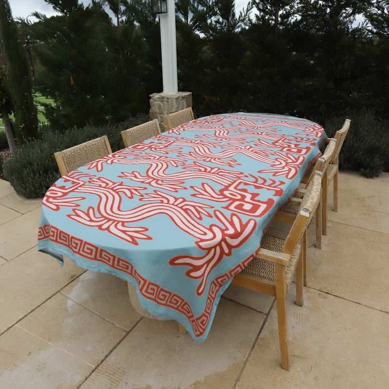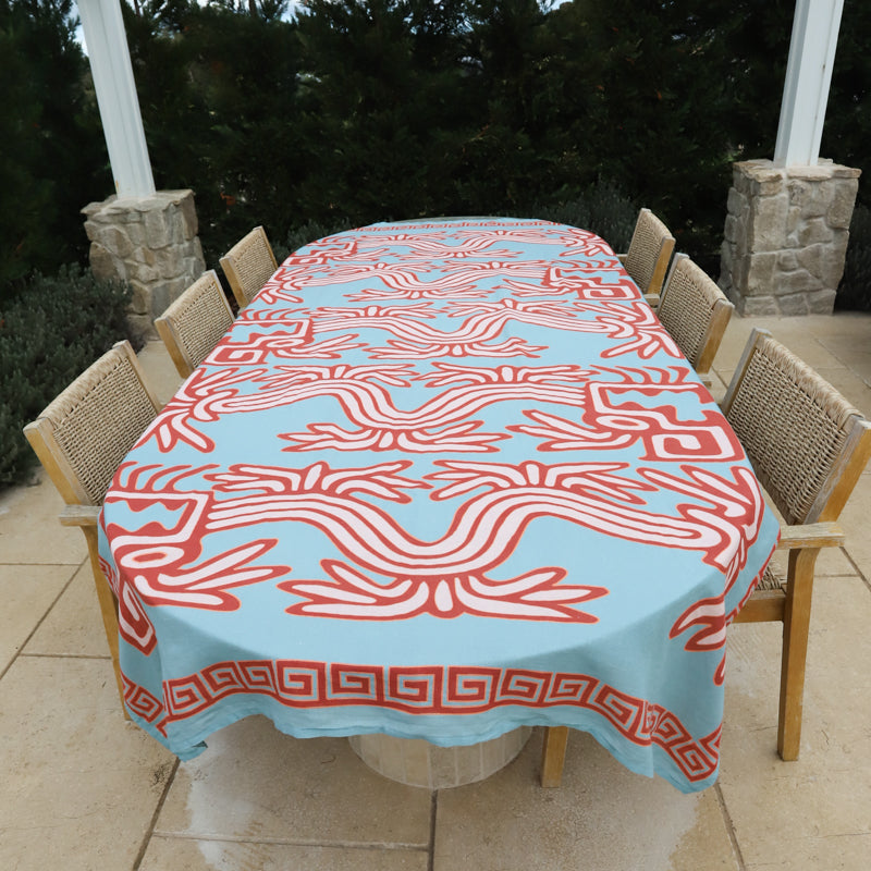 The Rainmaker Tablecloth, adorned in an oversized illustration of the Quetzalcoatl, patron of rain. This feathered serpent print extends the entire length of the table bordered by a geometric key design. Created in a powder blue with rich rust and peach highlights. The core ingredient of any great table setting. Designed to be paired back with matching print or plain napkin sets and crockery staples from the home. Made to mix and match.