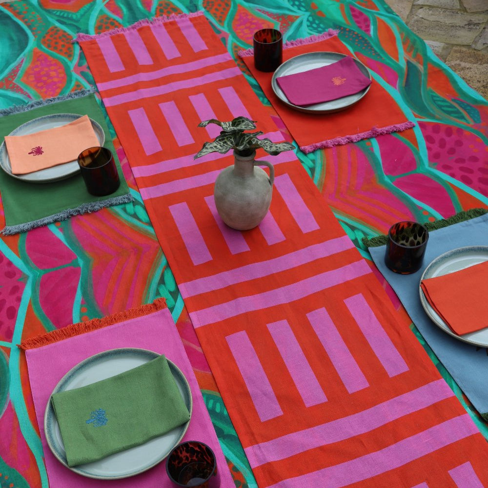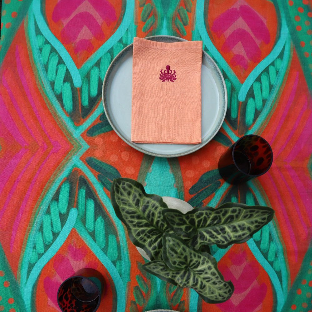 The Toco Tablecloth, illustrated in a cocktail of summer colour enriched with strong brush strokes and painted pattern reminiscent of jungle vibes from the Amazon. The core ingredient of any great table setting. Designed to be paired back with matching print or plain napkin sets and crockery staples from the home. Made to mix and match.