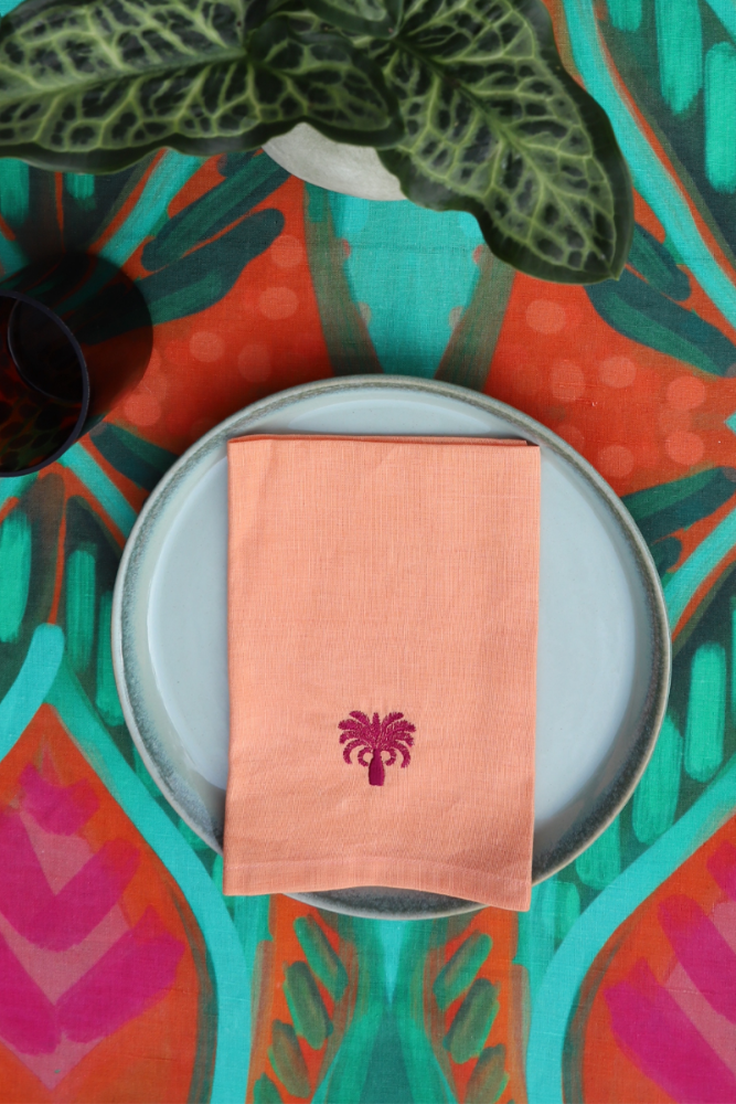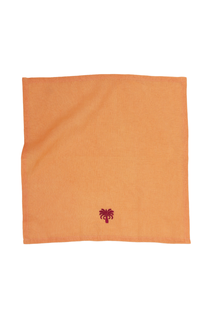 Hand dyed apricot linen blend napkins embroidered with a contrast palm illustration. This classic napkin set contains two cloth napkins that can be paired with complimentary table linen. A refreshing garnish to the table. Practical and stylish, our cloth napkins are statement pieces that blend well with staple dinnerware.