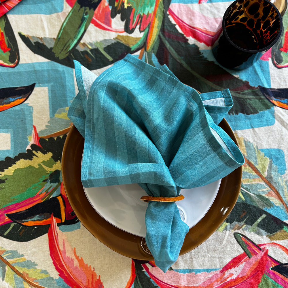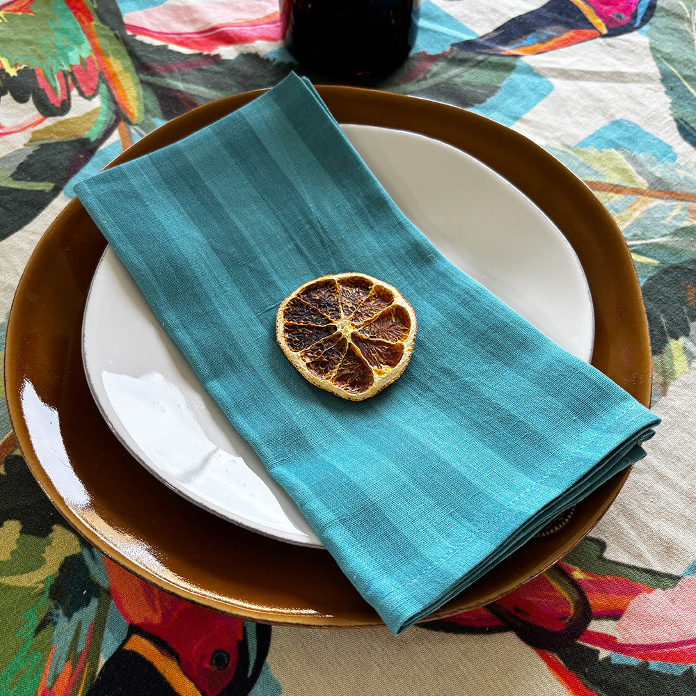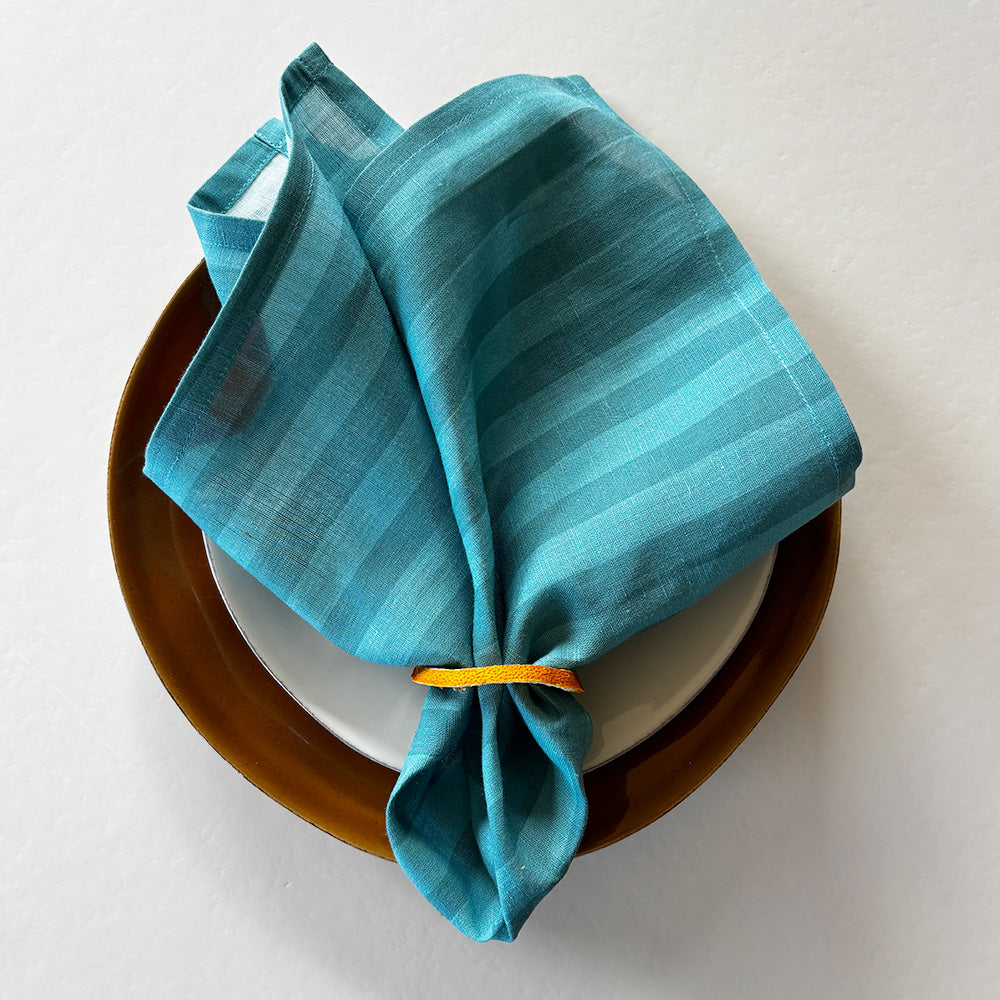 Drift, light blue striped napkins. A colourful and practical garnish for the table. Intended to mix and match, designed to be paired back with summer napkins and staple crockery from the home. Napkin set of 4.