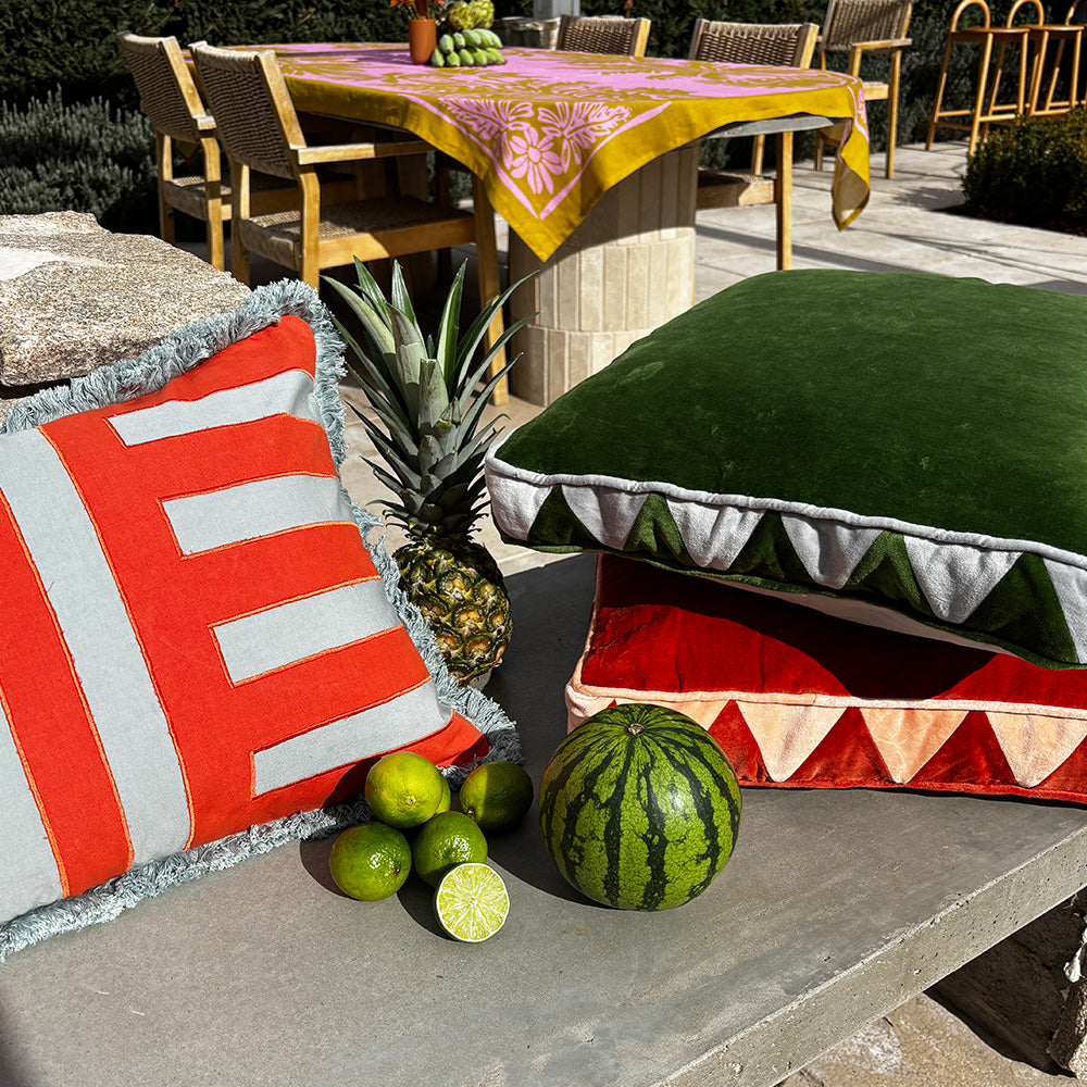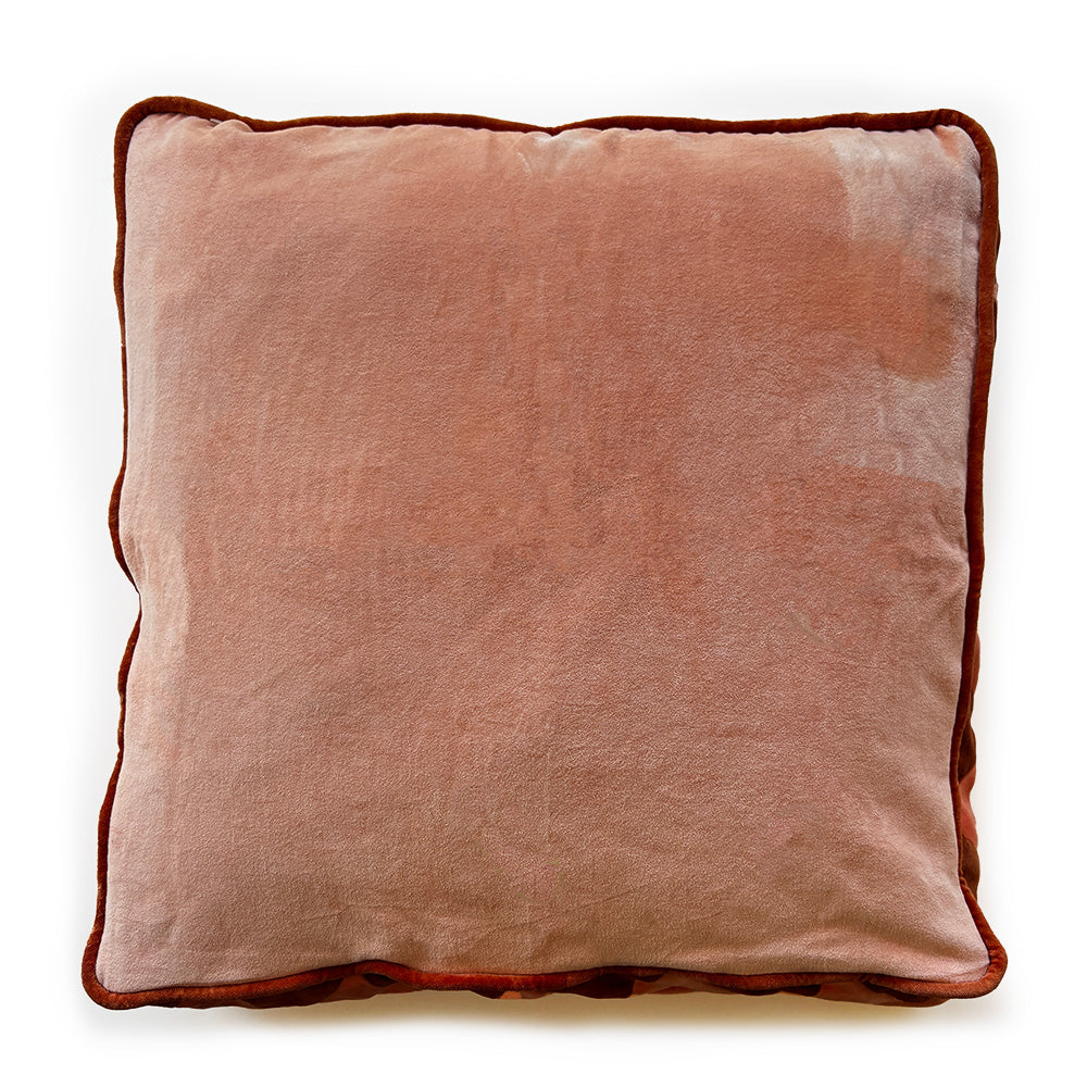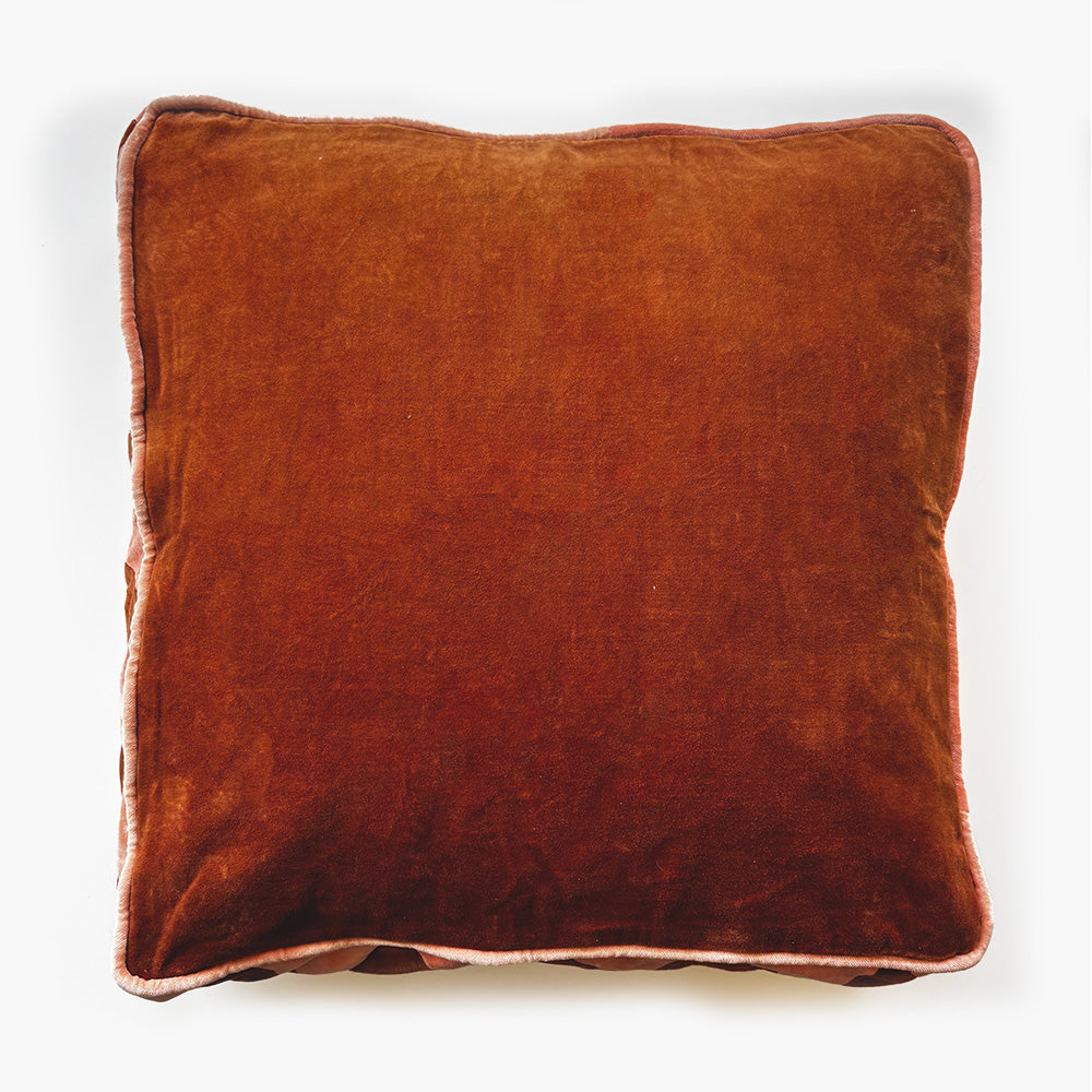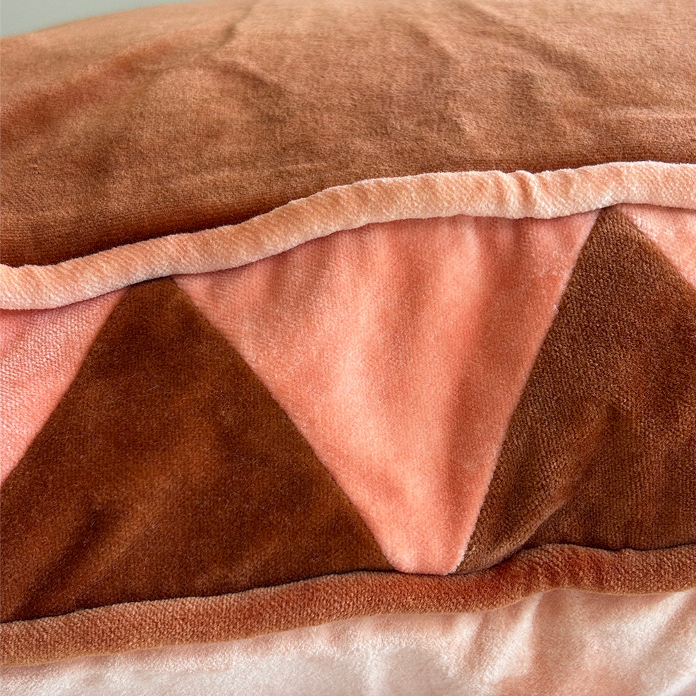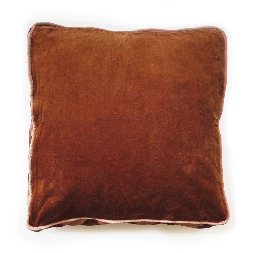 Colour the couch with cozy cushions that are full of personality. Complete with a zigzag detail trim through the gusset, this contrast velvet cushion is a fun addition to any room. Designed with a rust and peach side and invisible zip. Includes an Australian made feather/poly insert as an option.