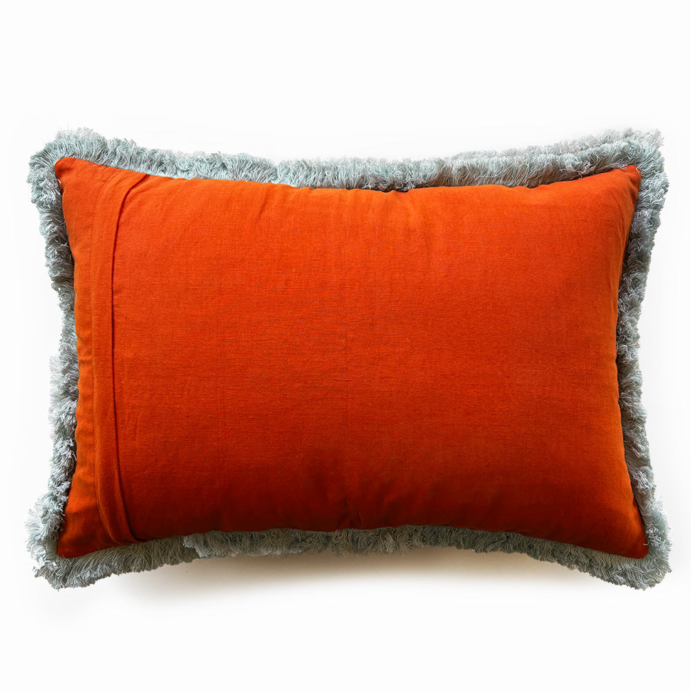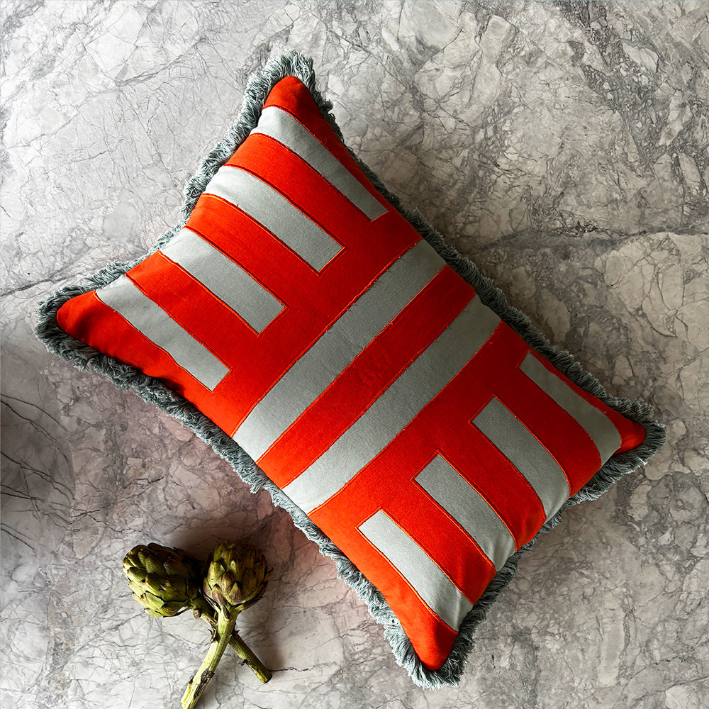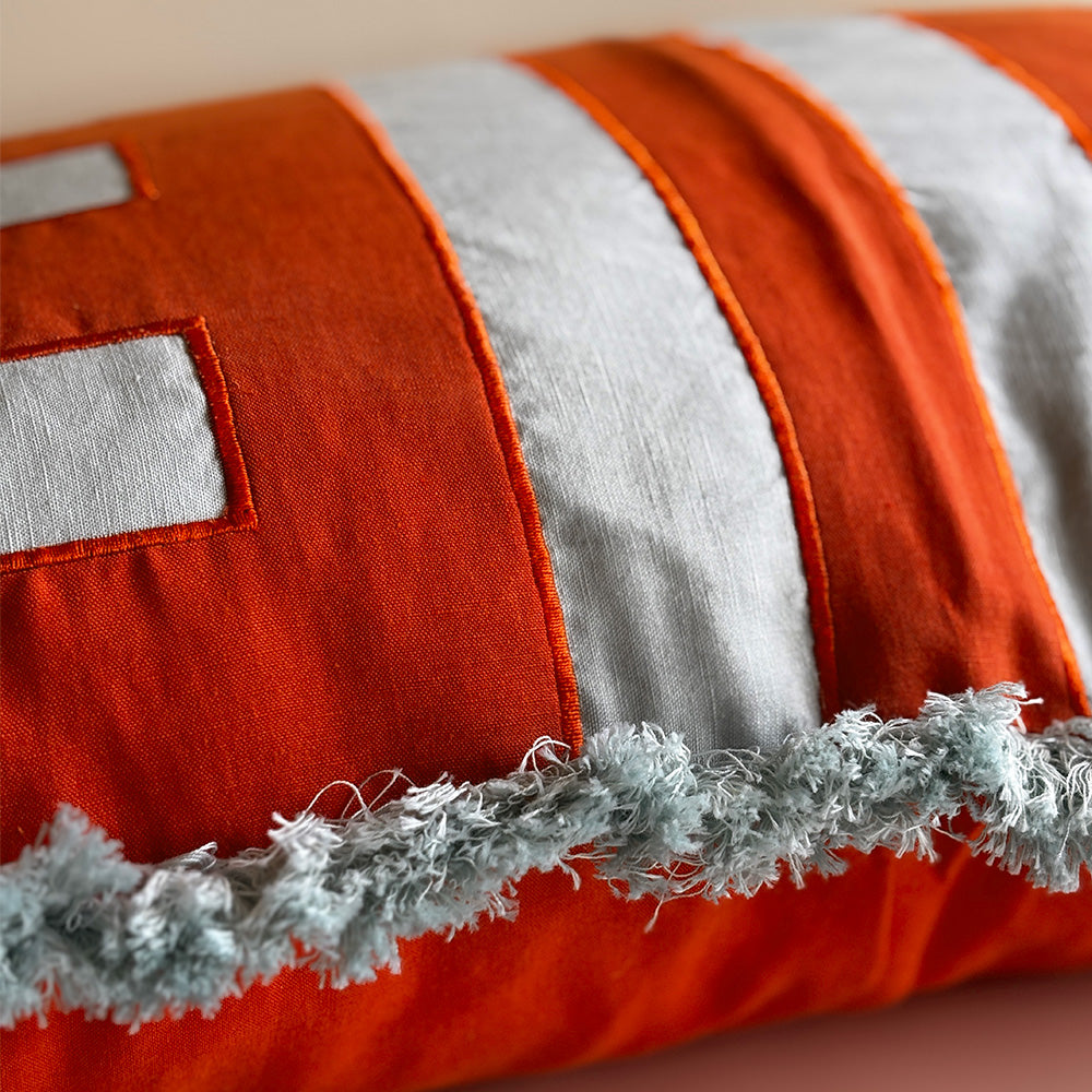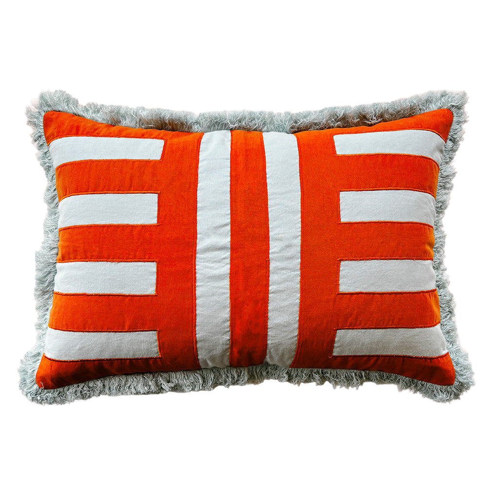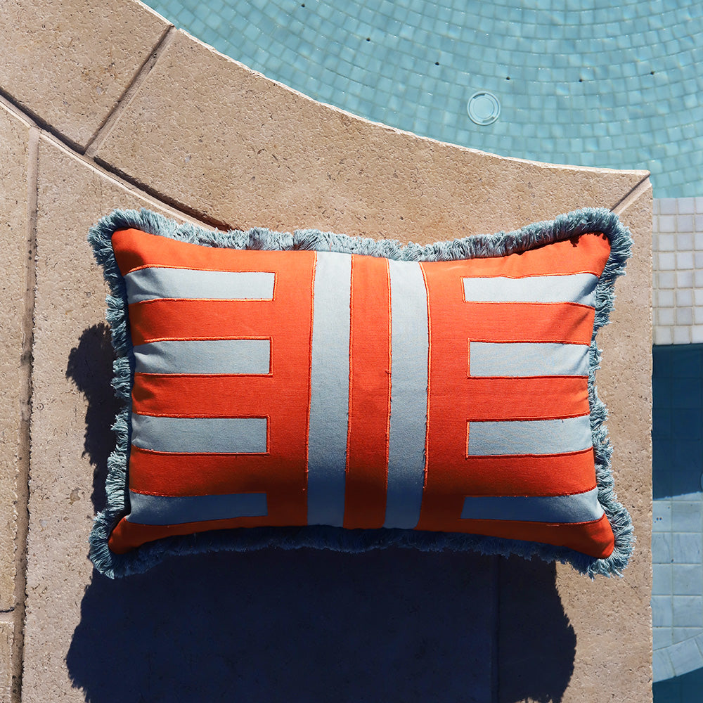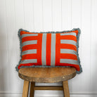 Colour the couch with cozy cushions that are full of personality. Designed with a bold geometric embroidered stripe and complete with contrast fringe trim this rectangular red and blue statement is a summer staple for any room. Australian made feather/poly insert optional.