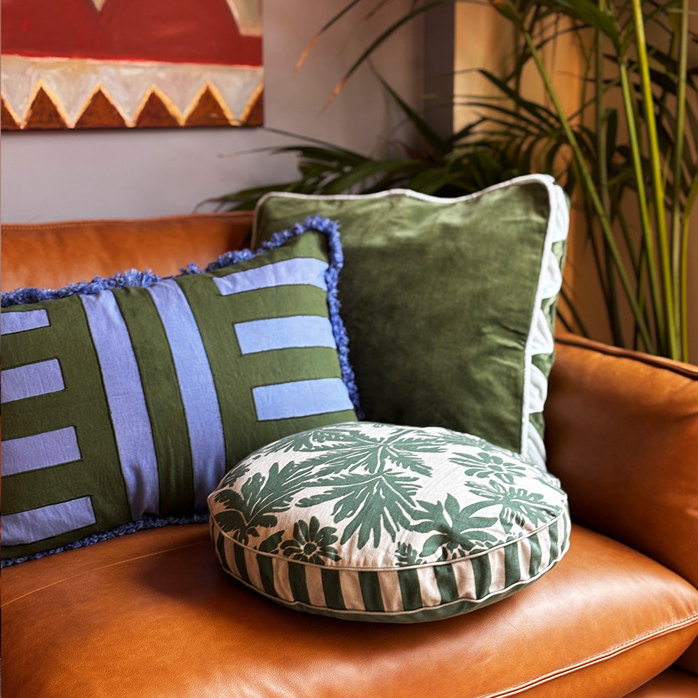 Colour the couch with cozy cushions that are full of personality. Designed with our much loved Elm palm print complete with contrast stripe gusset this round statement cushion is a summer staple for any room. Australian made feather/poly insert optional.